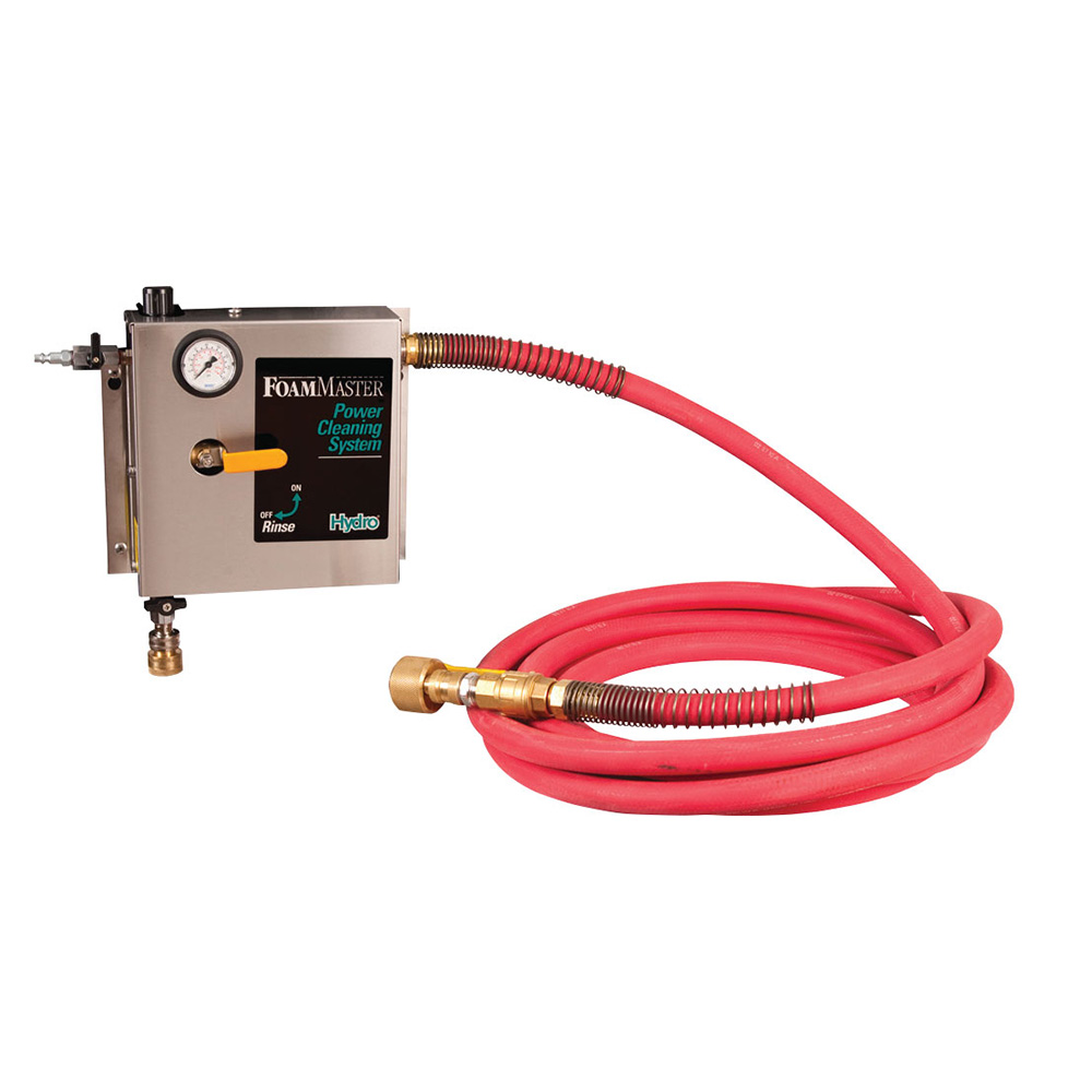 Compressed Air Foam Cleaning Units from Hydro Systems. Foam Master units automatically dilute chemicals to your desired ratio. Chemical resistant components allow for use with aggressive chemicals. City water pressure and compressed air combine to create rich, clinging foam. Operates on only 40 PSI air pressure. 25 ft. hose and nozzle come with all units, (additional 25' ft. can be added if required). Easily throws foam from 10 to 25 ft. Stainless steel wall mount case and rinse option is standard on all models.