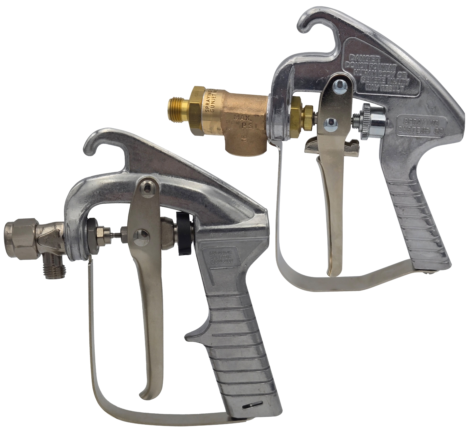 23H GunJet: Light-Duty, less spray tip. For use with interchangeable TeeJet spray tips. Brass inlet body, aluminum alloy handle. Pressures to 1000 PSI. Flow to 5-GPM. 1/4" MPT inlet connection. Stainless steel valve stem. Nickel plated steel trigger. Teflon seat and packing with adjustable external packing nut.