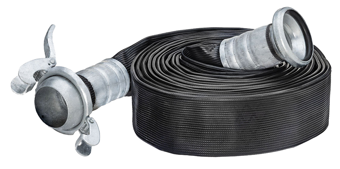 Hose, Layflat Oroflex, Black, 4IN x 50FT Assembly, Aluminum Bauer Style Male x Female Ends - Crimped, 175 Psi