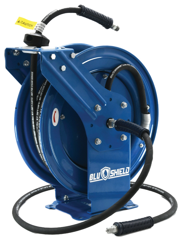 Heavy-duty, Dual Arm Hose Reels. Spring Retractable design features 18-gauge Powdercoated steel or 304 Stainless steel construction. Heavy duty spring and 12 point ratchet helps to easily lock out reels for shorter hose lengths when needed. Special internal system reduces vibration for quieter operation and longer spring life. Reels can be easily mounted to walls, floors, ceilings or trailers. Great option for direct use or to feed portable pressure washers for added hose lengths.