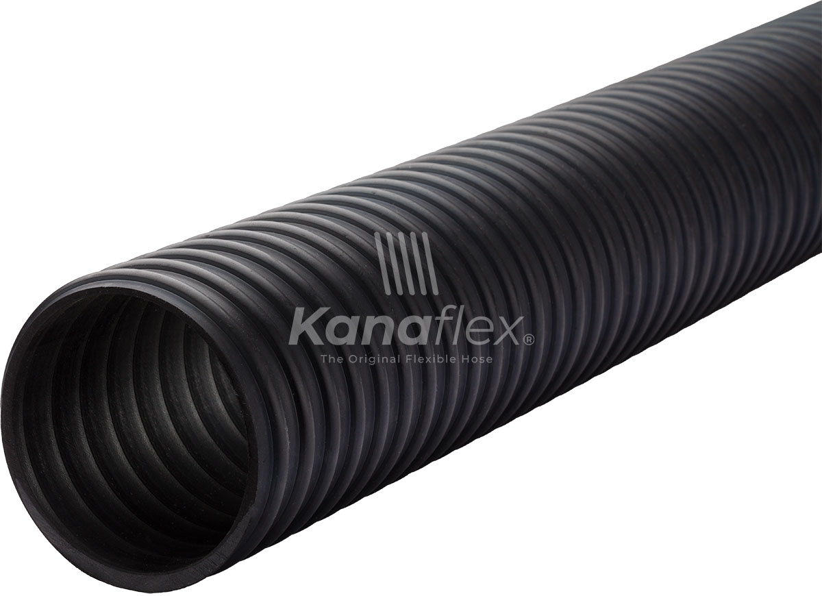flexVAC™ lite 180 AR (180 BL) Kanaflex Material Handling Hose: Designed for cotton, industrial plant services, street sweepers, light-duty vacuum recovery, grain clean-up, granular fertilizer, rock, wool, woodworking dust control, fiberglass or any lightweight abrasive material that can be moved by air pressure. Temperature range: -40° to 140° F. Not suitable for continuous handling of heavy particulates – see 180AR for heavy-duty applications. Construction: SBR Rubber blended with static carbon with black rigid PVC Helix. Corrugated OD. No Grounding Wire. Available up to 12” ID.