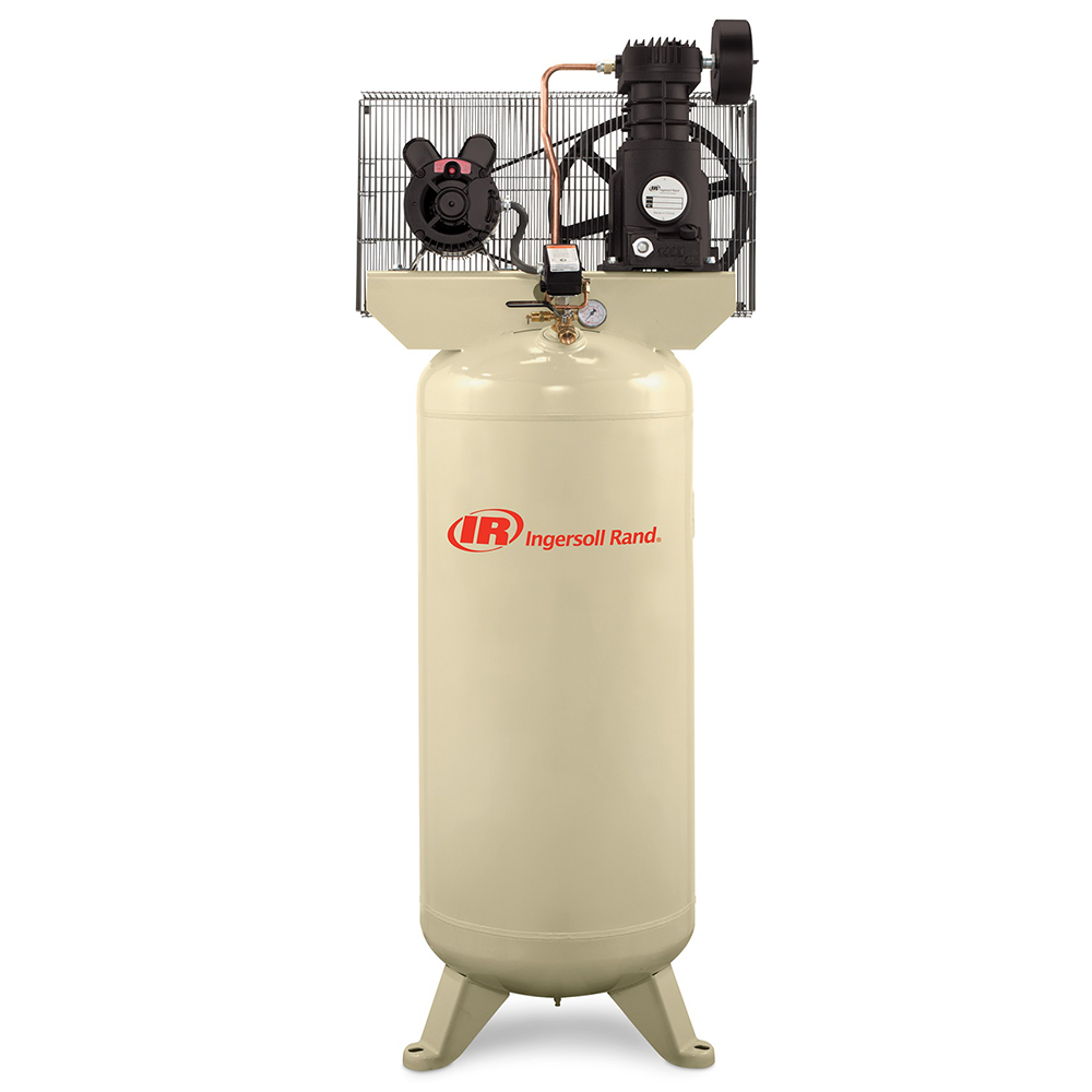 Single-stage Ingersoll Rand air compressors are some of the most popular electric air compressors in the world, offering exceptional durability and maximum air power performance. These 60-gallon reciprocating single-stage air compressors feature a 100% cast iron construction that's built for reliable, long-lasting durability. Powerful electric motor starters are wired and mounted right on the unit—increasing air compressor efficiency and reducing unit footprint. Air compressors include single-stage continuous duty operation with automatic stop/start control, relief and manual drain valves, oil lubrication, and low-maintenance components. These units are available with a 60-gallon vertical air compressor ASME tank.