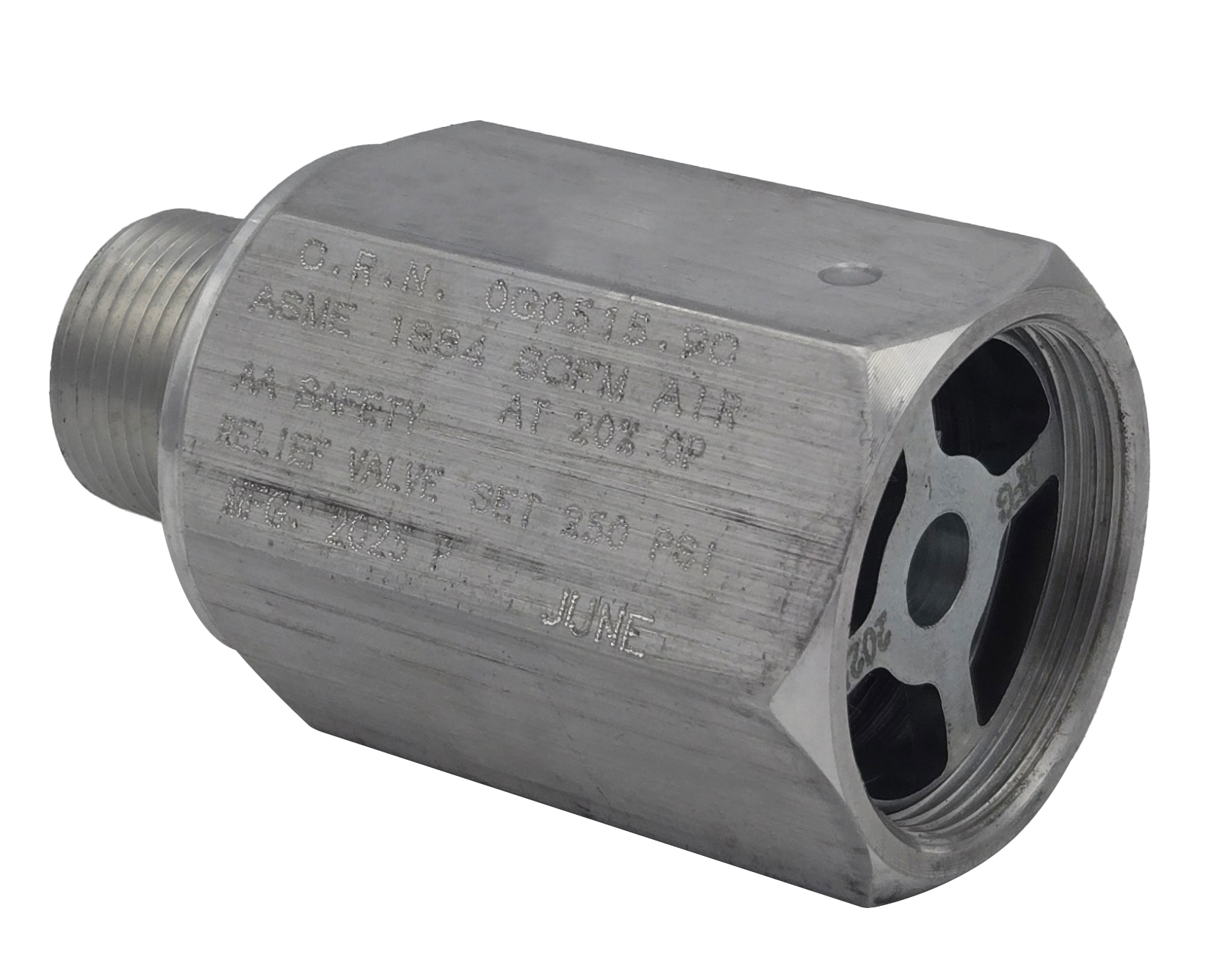 All Vapor Relief Valves are permanently marked with their identifying catalog number, date of manufacture, *removal date, set pressure, and flow capacity. All ammonia tanks should have provision for vapor relief valves with adequate capacity to meet discharge requirements. These valves meet ASME standards.